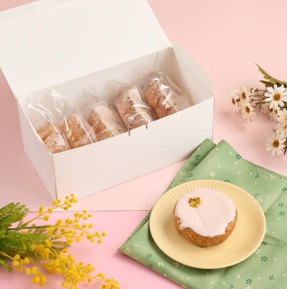 コクのあるカスタークリームを包んで香ばしく焼き上げました。表面に桜風味のチョコで彩りを添えて、春らしさを感じられるデニッシュに仕上げました。